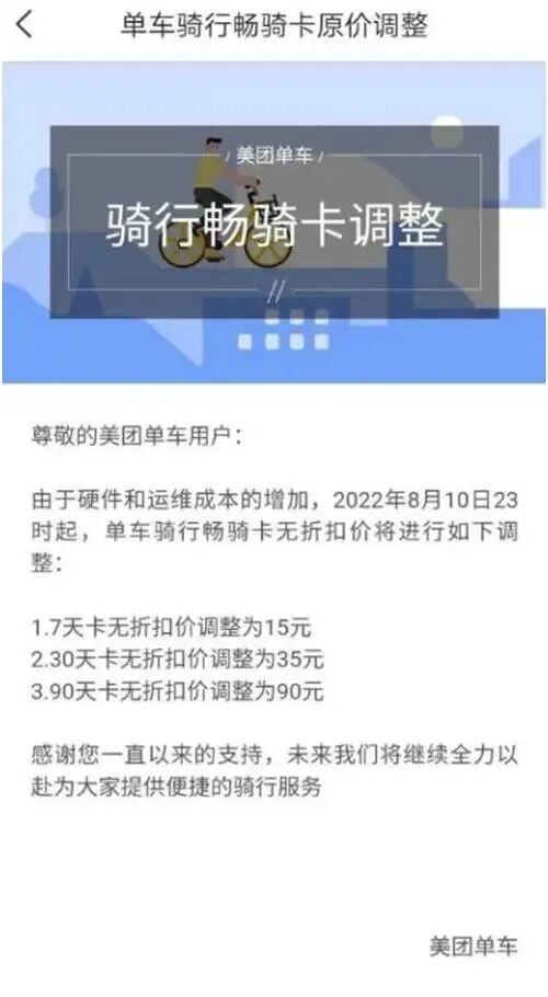 美团单车8月5日宣布将于10日23时起,对单车骑行畅骑卡无折扣价格进行涨价。7天、30天、90天三档骑行卡无折扣价分别从10元、25元、60元调整为15元、35元、90元。单次骑行价格未变,仍然是1.5元/半小时。
