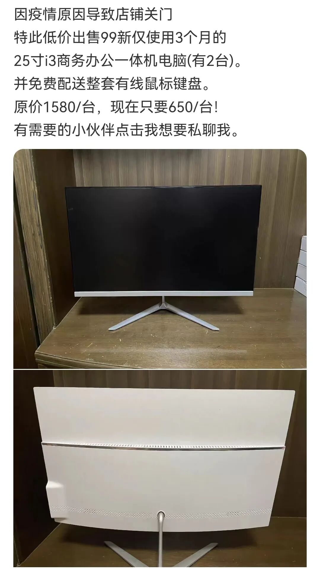 下面这位是厦门的店主,因疫情原因导致工作室关门,正在转卖2台仅使用了3个月的商务办公电脑。