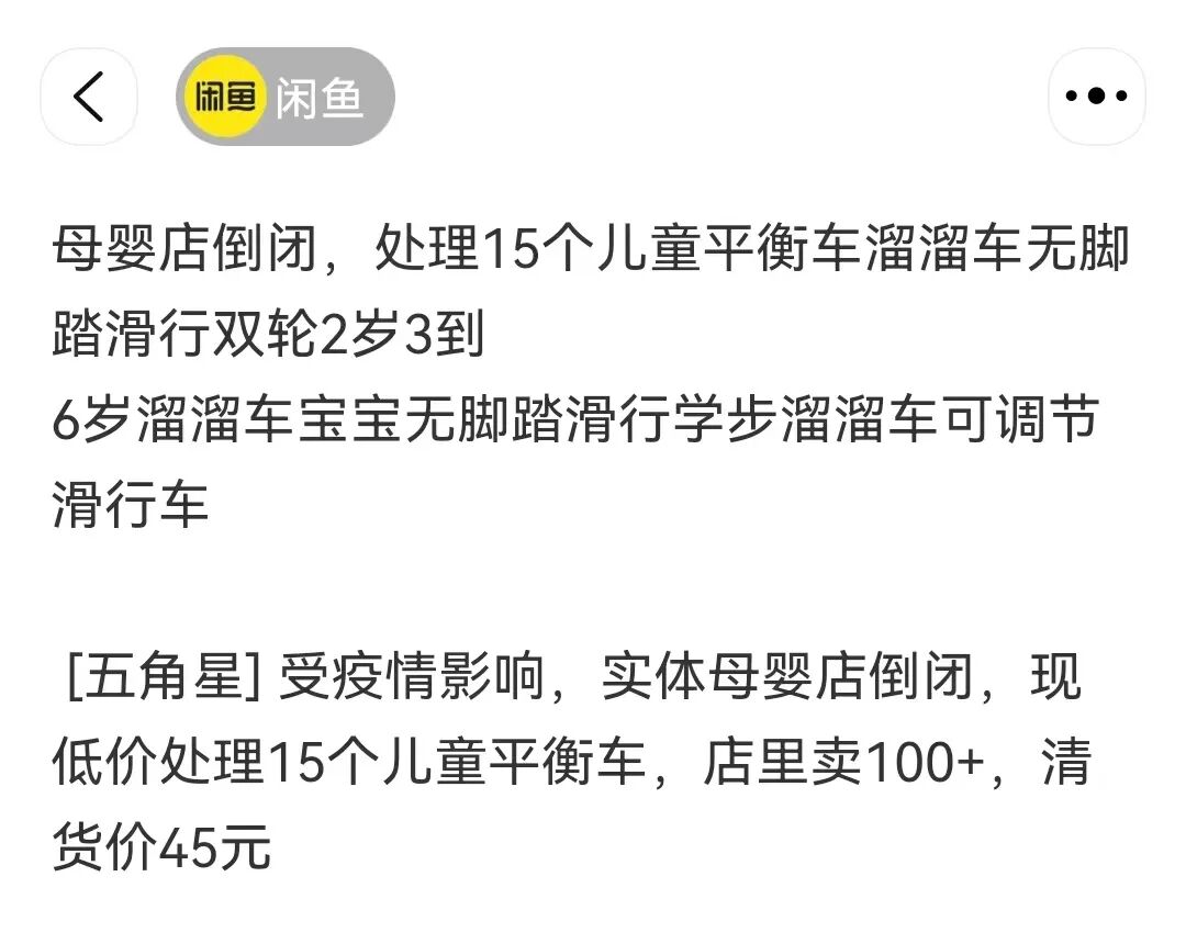 这位在河北的店主,因为母婴店倒闭,正在处理15个儿童平衡车,清货价半折不到,希望以此回笼一点资金。
