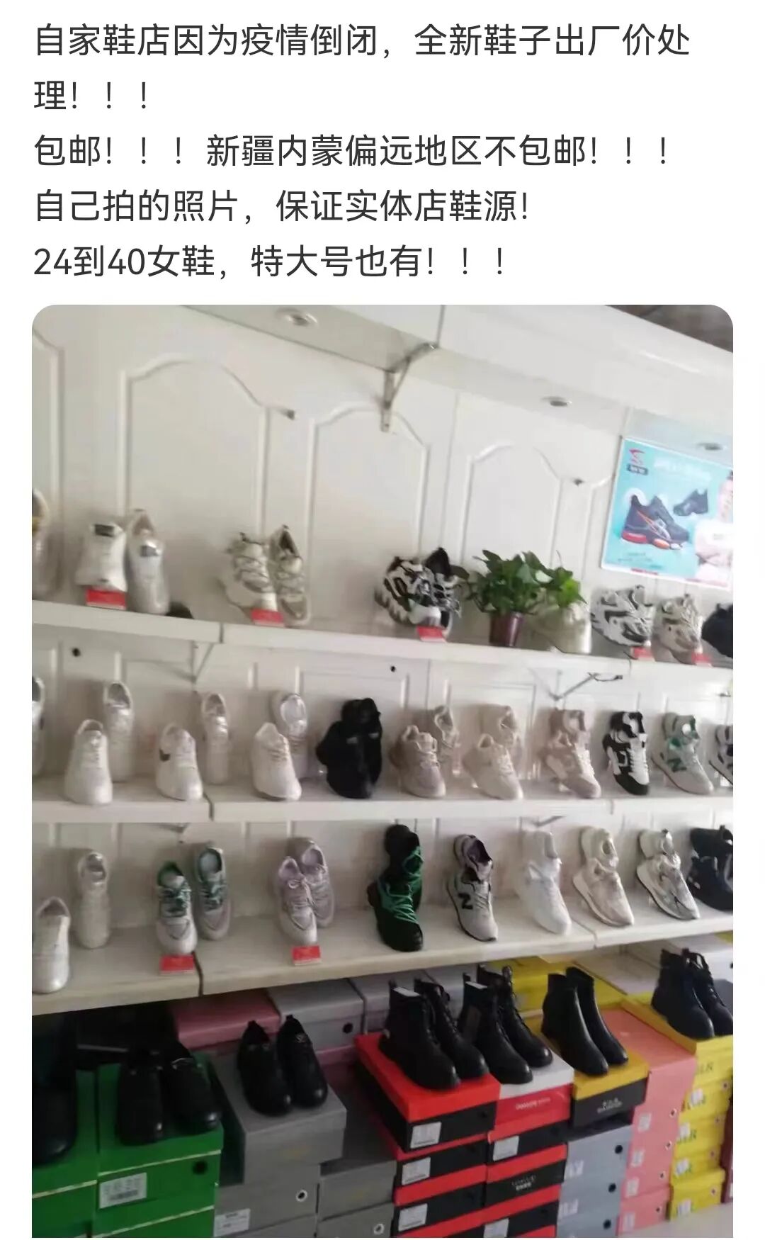 坐标玉溪、东莞等地方的鞋店店主,因疫情原因鞋店倒闭,全新鞋子正在出厂价处理。