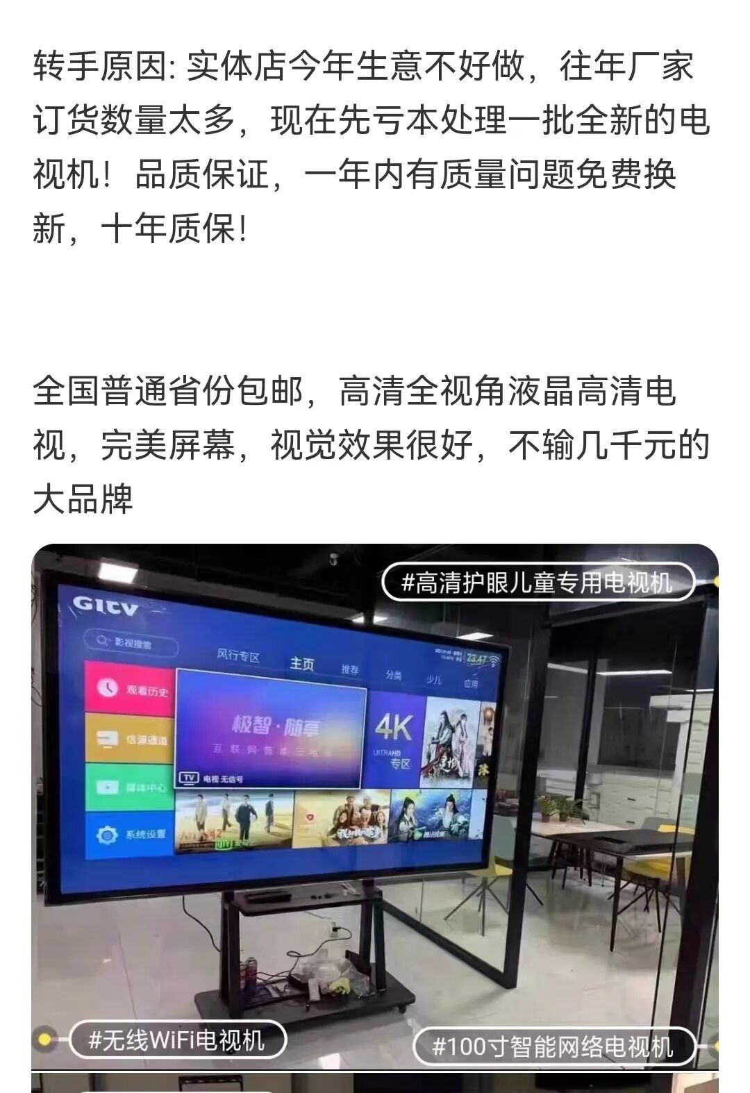 还有因为实体店生意不好做,往年订货数量太多导致库存挤压,未雨绸缪先亏本处理一批电视机的。