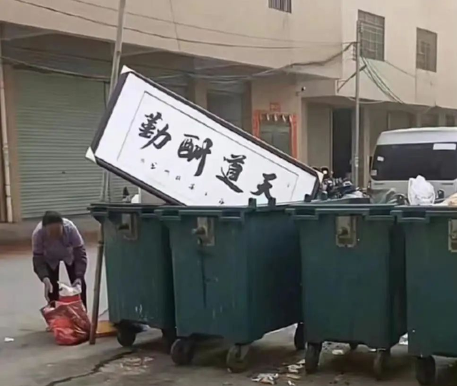 前几天在微博上看到一张图,一块包着四角的“天道酬勤”牌匾斜倾在垃圾桶里。