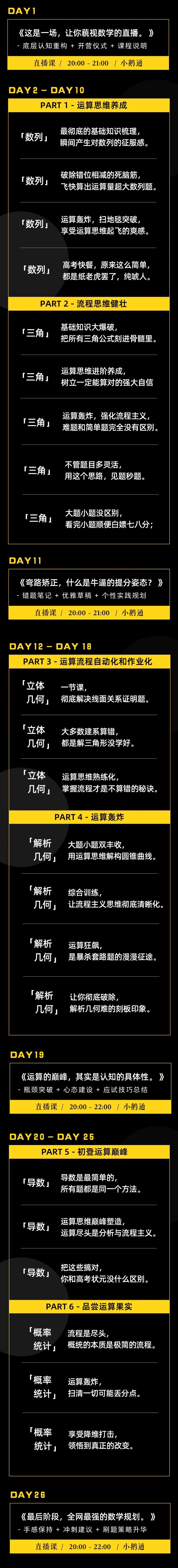 本课程针对的是最后阶段冲刺的高三学生,并配套了每天详细的数学任务。但如果你是高二,当然可以通过本课程由数学菜鸟迅速达到一个高水平,在进入高三前就赢在起跑线上。高一就算了,别贪。