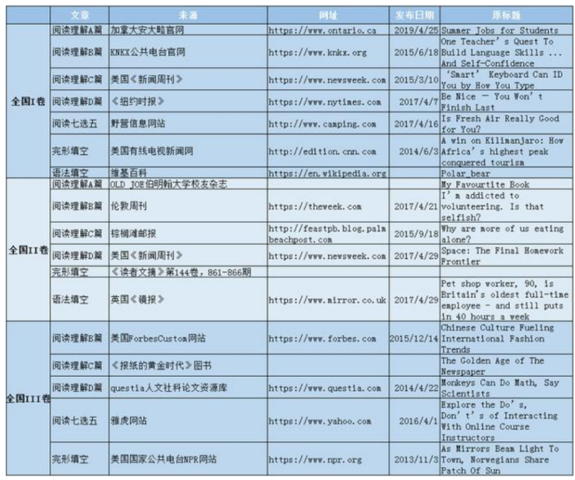 那我们就先来看一看全国1、2、3卷阅读理解、完型填空和七选五的材料来源(以2019年为例)