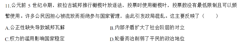材料①②:因为橄榄叶可以频繁使用,所以导致公民担心被流放而拒绝参与国家管理,而不是因为在投票过程中的不公平,所以公正性缺失是无法在材料中找到对应的。
