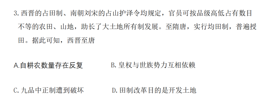 所以在这里我们就大概知道这是在讲什么了:将西晋、南朝刘宋和隋唐时期的土地制度进行对比,对比的内容:土地制度/土地分配的对象:西晋、刘宋把土地分给官员,而隋唐时期把土地分给农民。