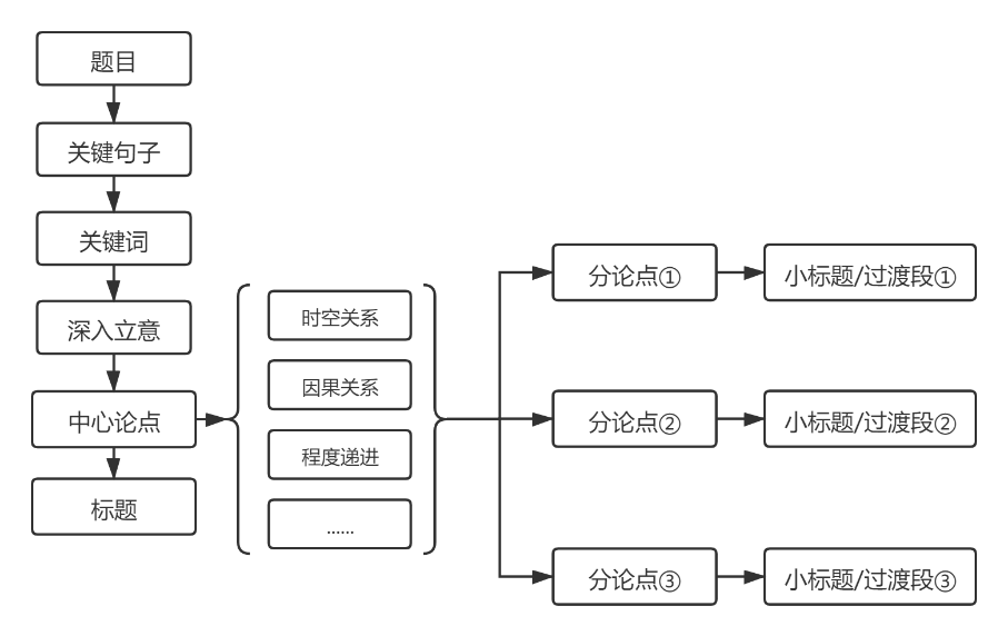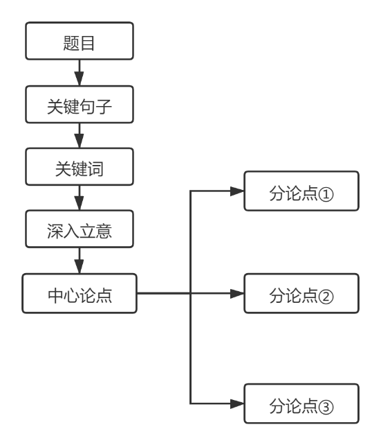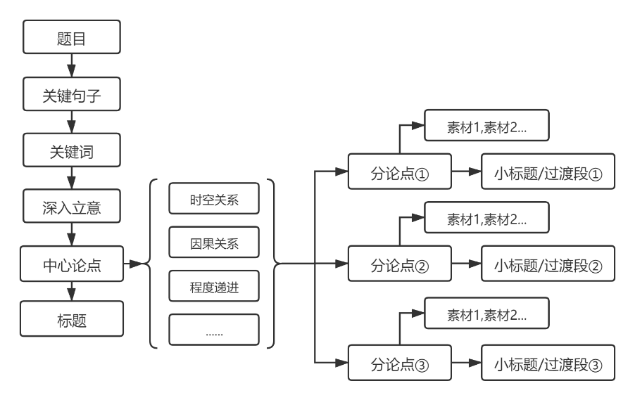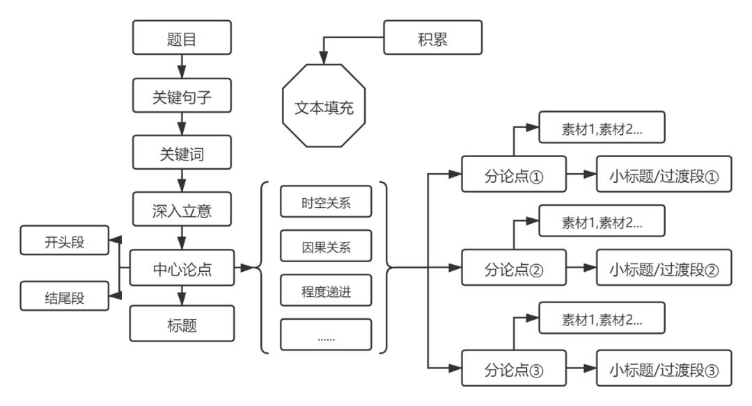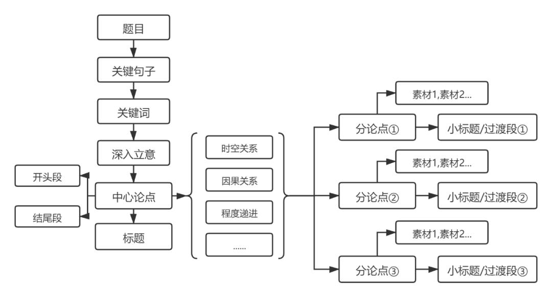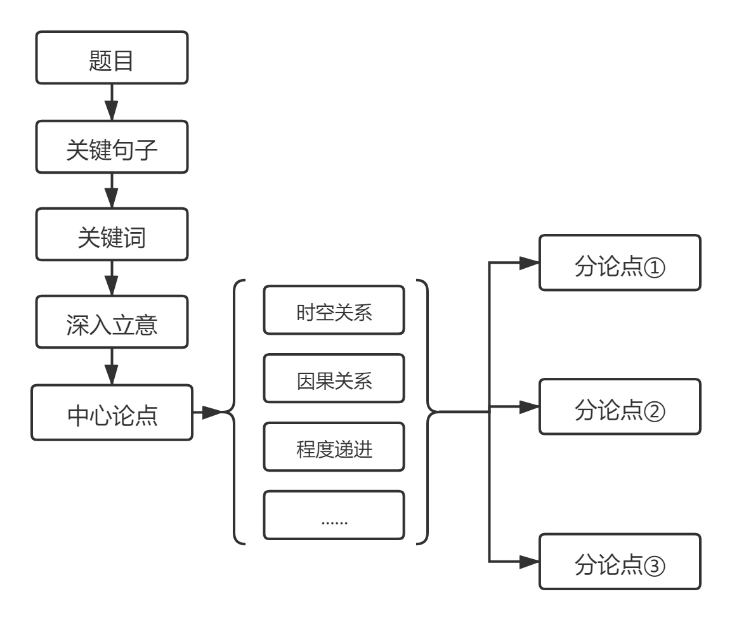 在从题目提取出知识点之后,需要我们利用总结的解题步骤完成对知识点的解析,而在作文中固有的解题步骤即为以各种关系分化的分论点。