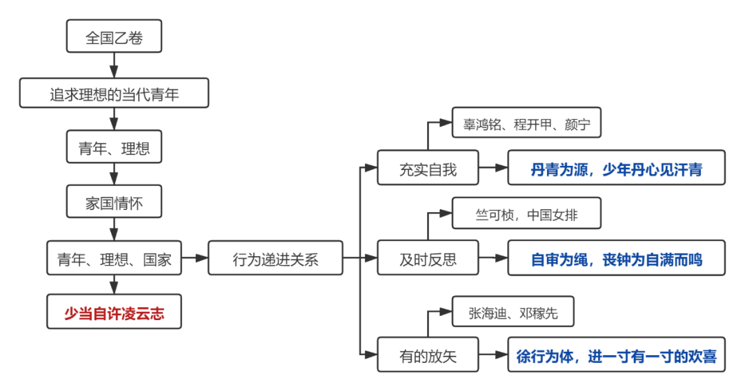 本题最需要关注的就是一句话“修身以为弓,矫思以为矢,立义以为的”,这句话是在题目中强调强制让你作为分论点的思考,在这个基础上,我们去以青年联系理想,以理想联系国家,用家国情怀结合青年发展,将个人发展与国家发展契合,完成自身的蜕变与成长,在这个基础上建立立意