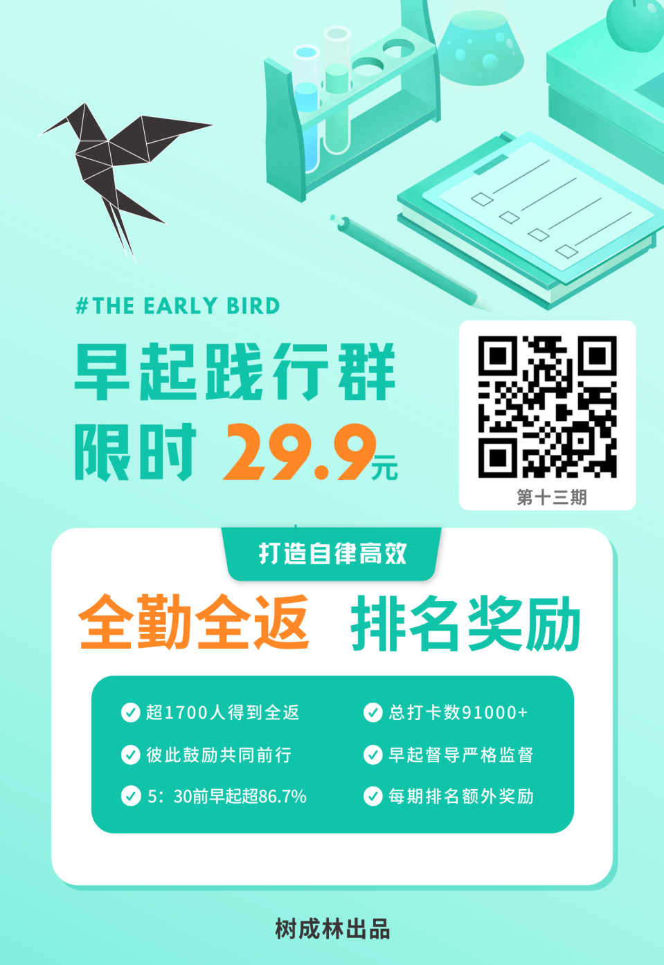 今天是树成林高中早起践行群第13期的报名时间,我们希望能够汇集到更多有决心有行动力的高中小伙伴,让大家在互相的见证中一起走好后面的路。