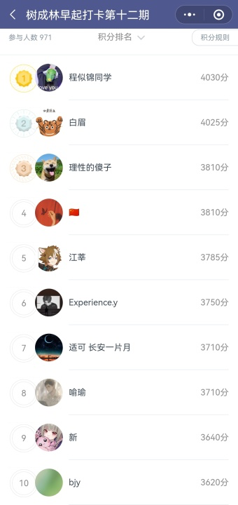 第十二期共有399名同学在月末完成了全勤打卡并获得了“全勤全返”的红包奖励,前十名的同学也成功获得额外红包奖励,所有同学共计在每天6:00前完成打卡17000+次,我们很高兴看到有越来越多的同学在作息习惯上迈出了有关自律的重要一步。