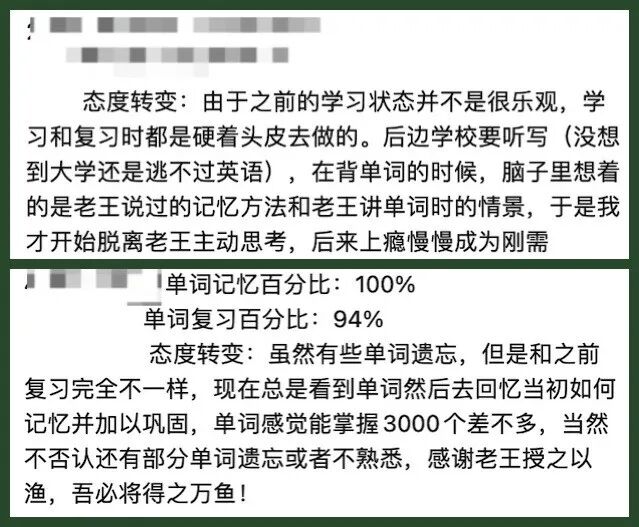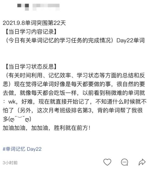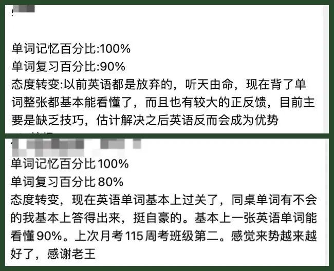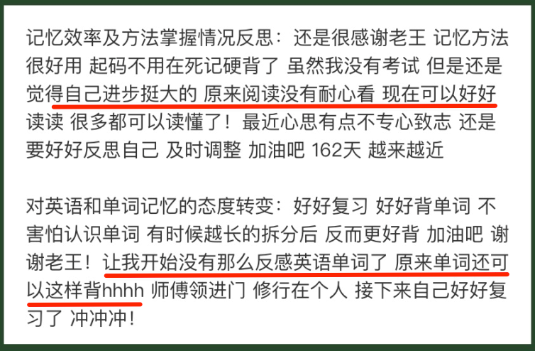 下面是一些同学在过程中的感受和评价,相信大家应该可以感受到他们对单词、对英语明显的态度变化以及明显且稳定的知识和习惯的进步: