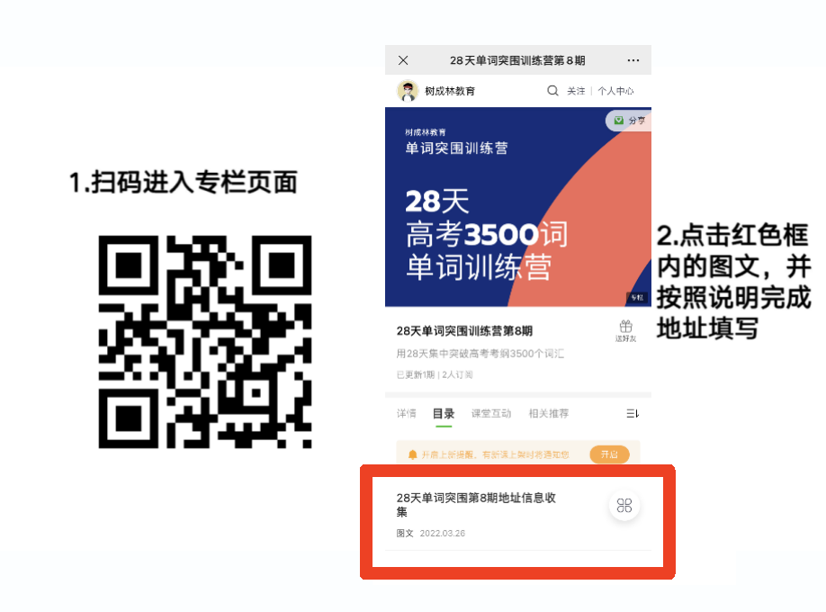 4.进入小鹅通「28天单词突围训练营第8期」专栏阅读第1篇文章,根据相应提示填写纸质讲义地址信息(地址务必仔细填写,否则无法按时收到纸质讲义),具体步骤如下:
