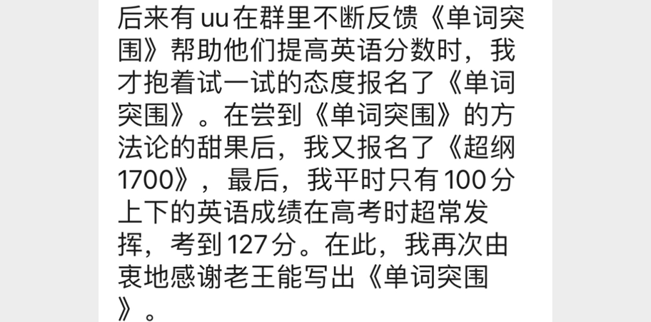 这不是自夸,因为大家对《单词突围》四级版的姊妹篇《单词突围:考纲3500老王背给你看》《单词突围:超纲1700老王背给你看》两套针对高考的词汇书超过13000条的正向反馈,以及超过1300人平均英语成绩提高17.4分的数据已经证明了上述逻辑的正确性。