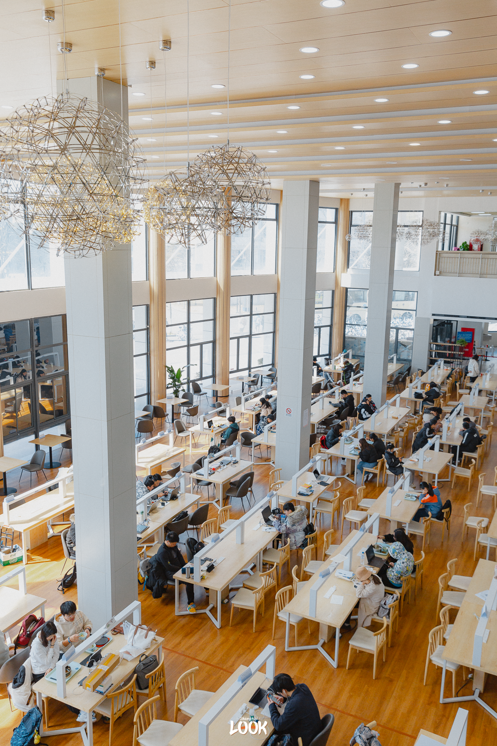 奉贤校区的第一食堂,专门划分了「自习区」,插座、桌面灯带、温润质感的桌椅样样不少,吃完饭立马投入学习。