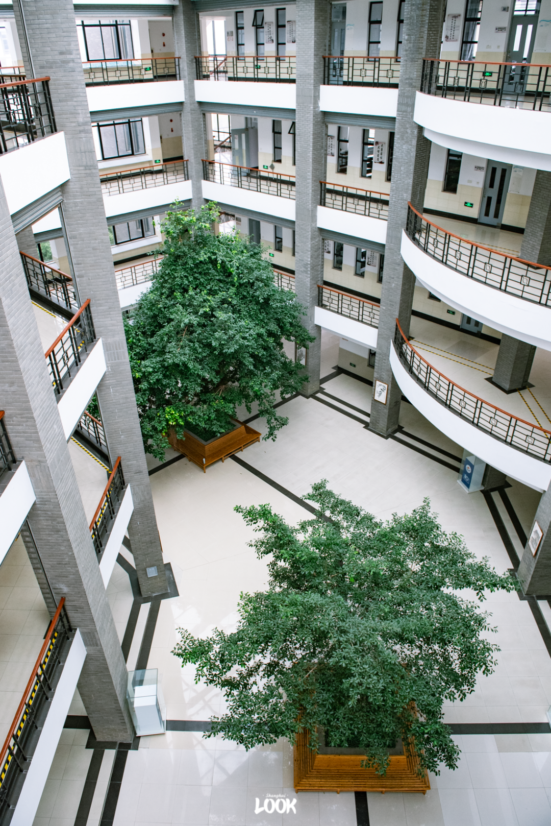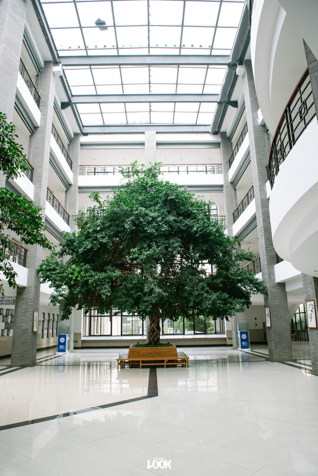 第二教学楼,是一个巨大的「阳光玻璃房」,两棵榕树安静地落座其中。榕树下,便是同学们平常的歇脚地。