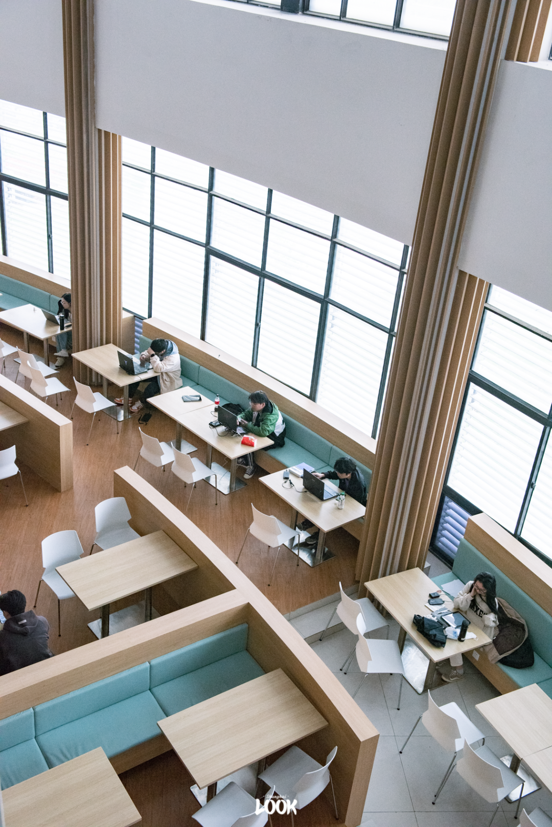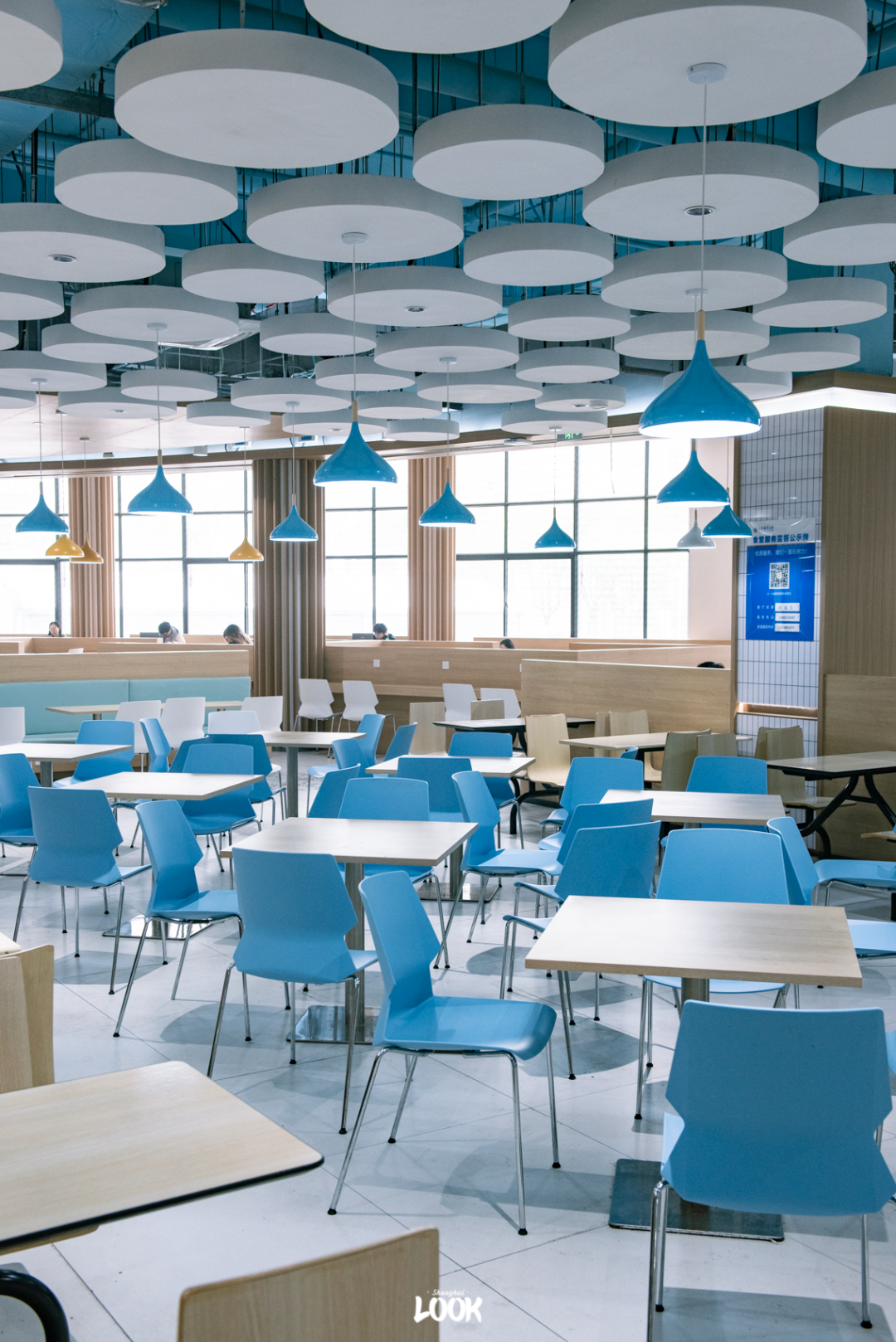 不愧是海洋大学,连食堂也自带清新气质,第一食堂随处可见蓝色元素。明亮舒适的食堂空间,成为同学们常去的“自习室”。