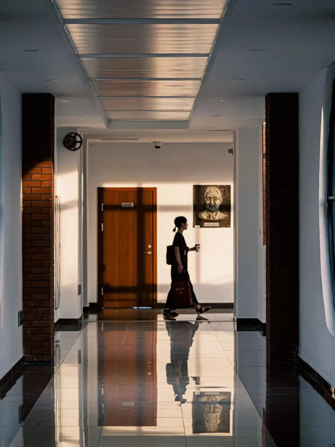 阳光透过玻璃倾泻而入,走在教学楼里的光景