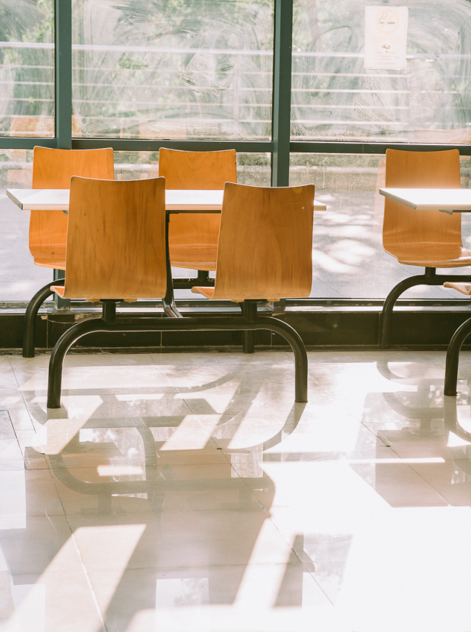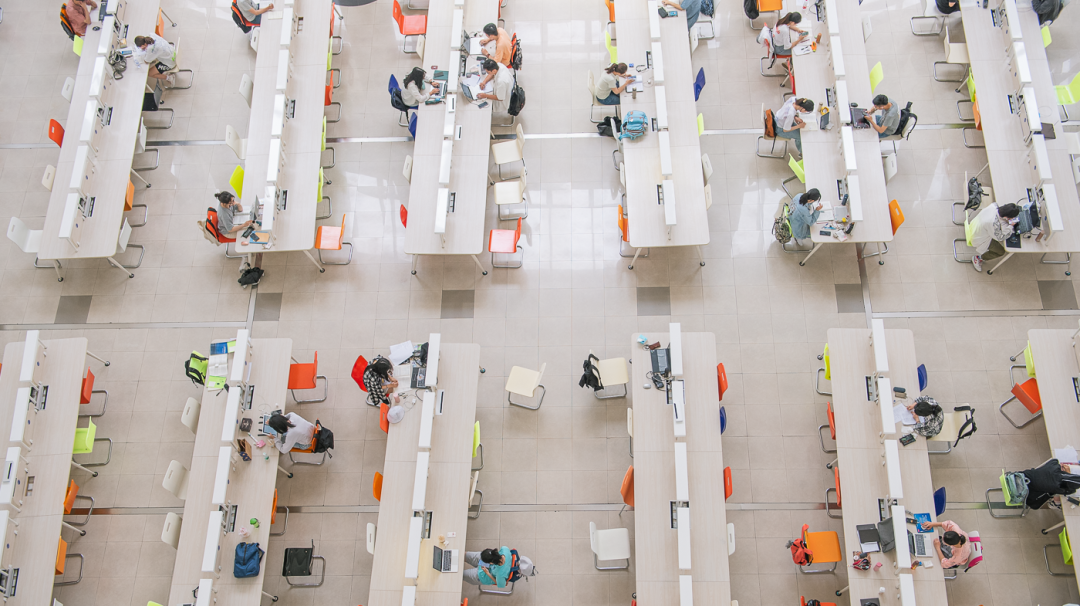 充沛采光下的自习室空间通透,五彩桌椅则俏皮点缀其中