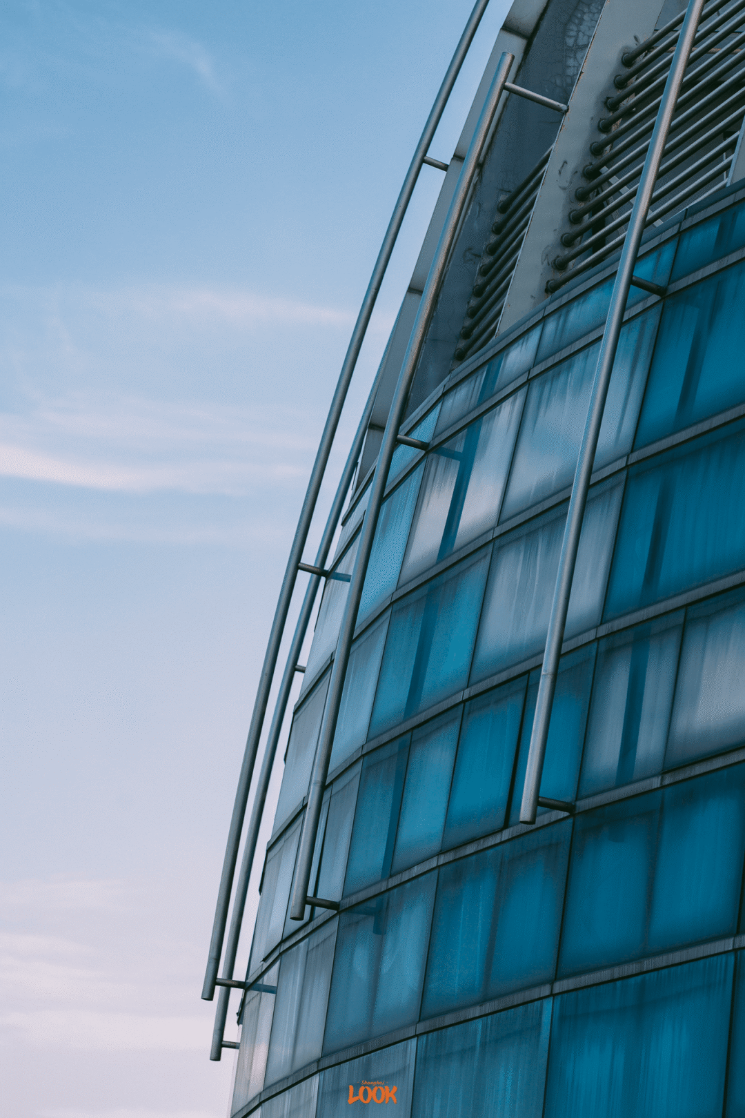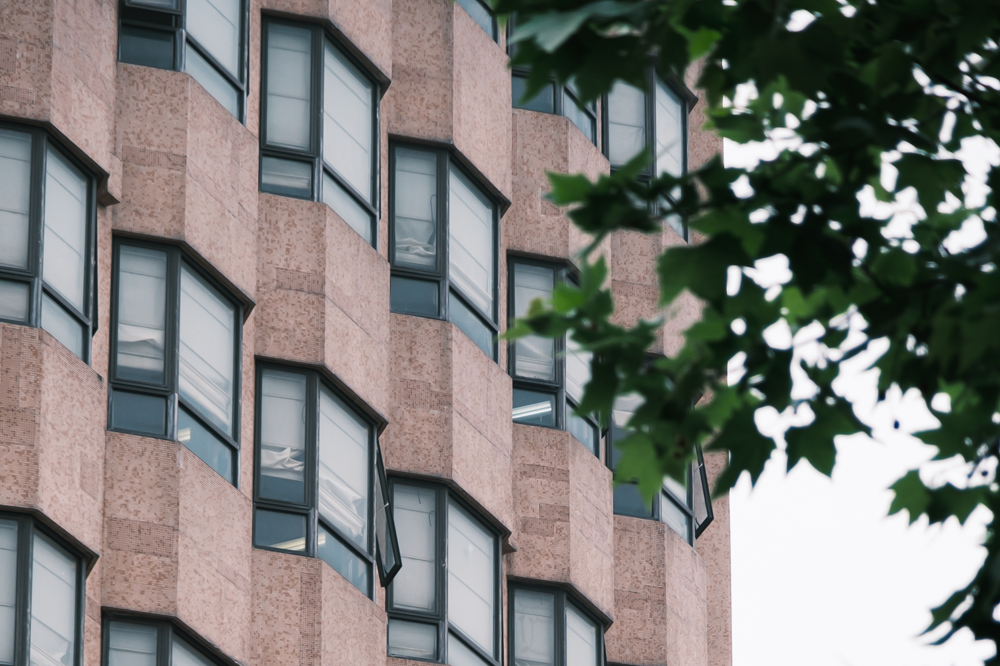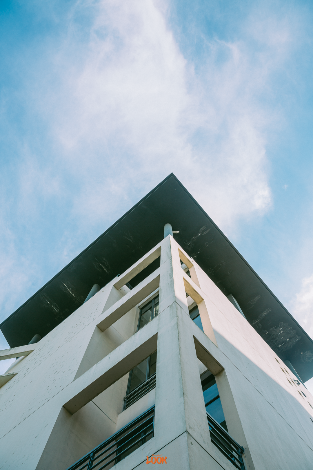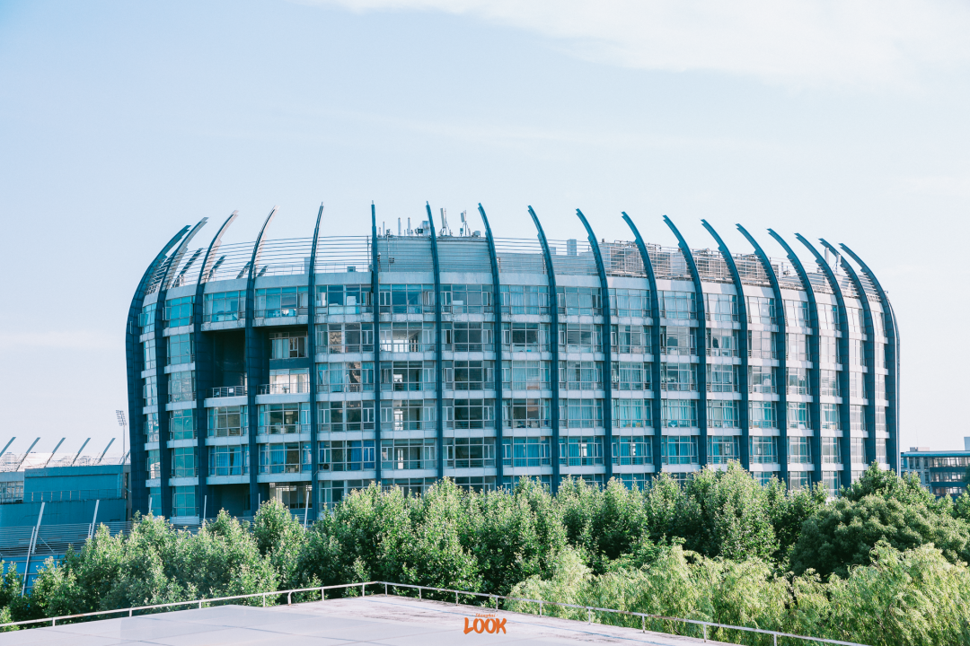 建筑由双塔楼组成,别致的多边形窗户层叠排列