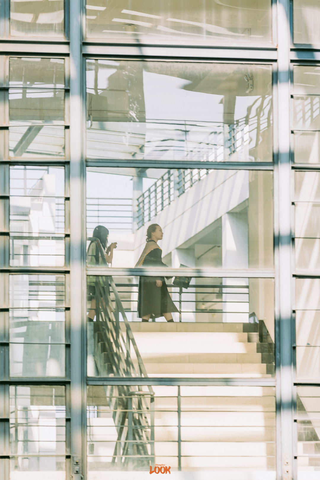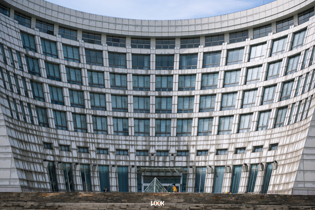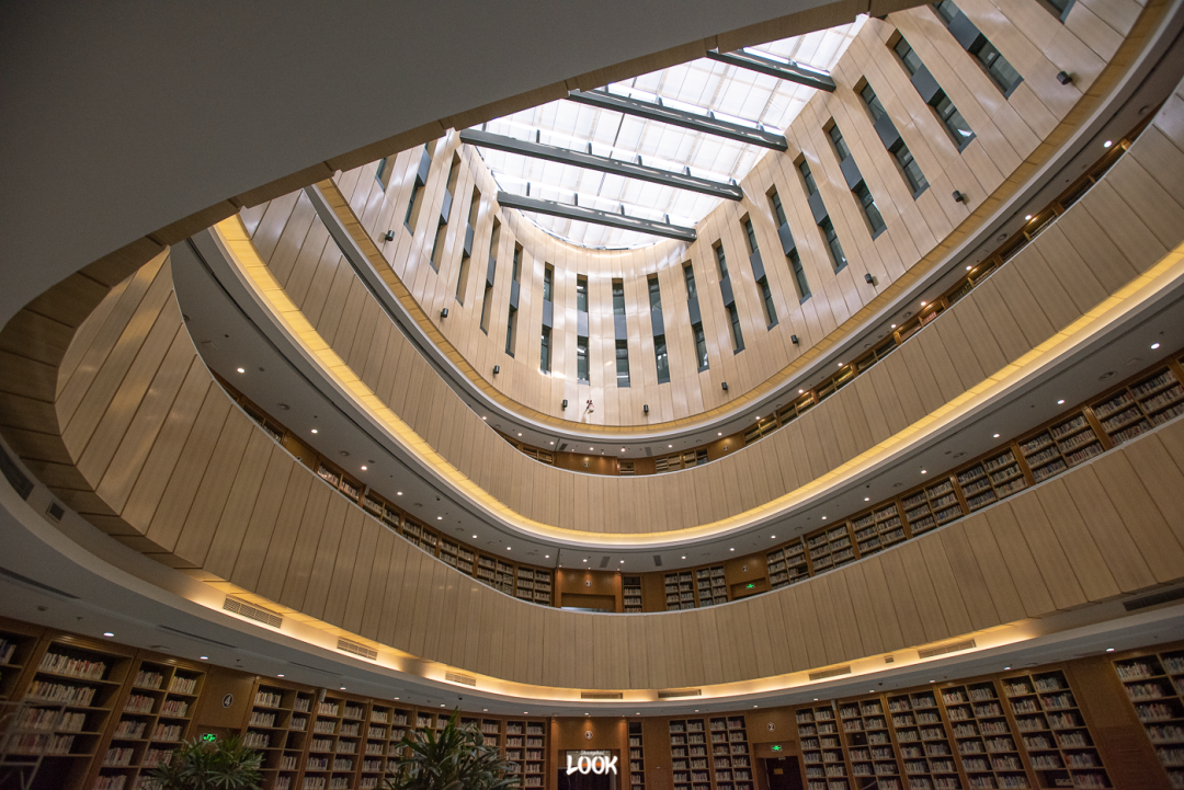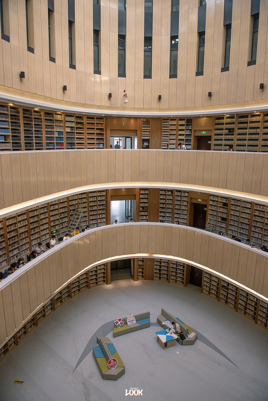 校本部图书馆是上大的地标建筑,也是同学们去得最多的地方;它的外立面像一本打开的书,俯视是一个三角形,与门口的玻璃金字塔相呼应。