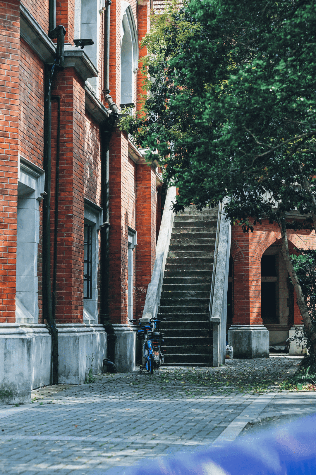 同济大学四平路校区的图书馆建于1970年 —— 建筑本身有点像一位脾性斯文的巨人,披着儒雅气质的清水红墙,却有着硬朗大气,充满视觉冲击力的建筑结构。