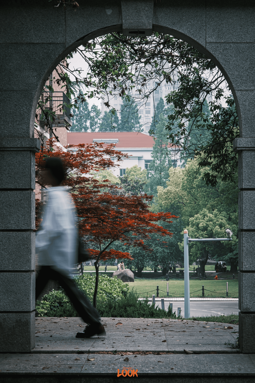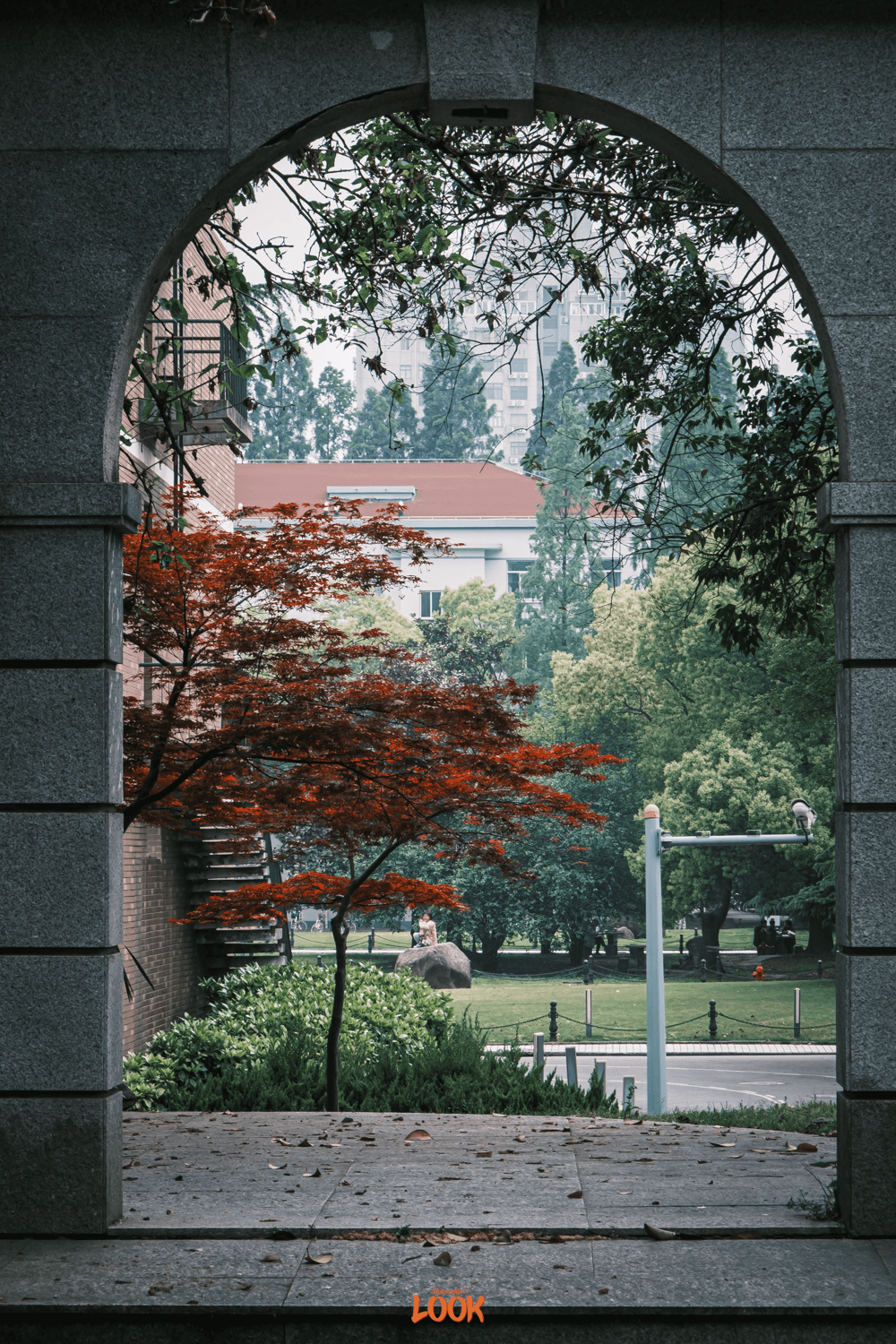 漫步千秋园,红枫又藏匿到园内历史建筑门洞中去了