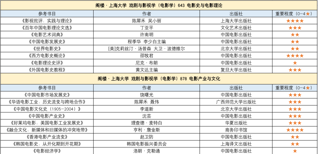 上海大学电影学作为全国最早的几个电影学硕士点,学术根基深厚,且有陈犀禾、金冠军、曲春景等一众资深学者奠基加持,因此一直以来是电影考研的Top级热门院校。需要注意的是,电影学硕在招生上是归属于一级学科戏剧与影视学来进行的,除电影学外,还有广播电视艺术学、戏剧戏曲学两个二级学科。三者考试科目不同,分开复试,但都以一级学科(戏剧与影视学)招生。