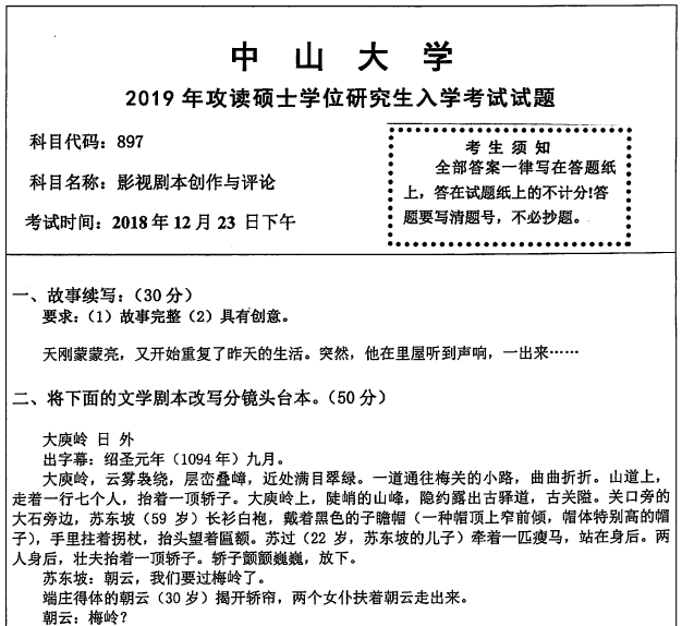 2.从考试课科目上看,684 中外电影史论五个论述题,每题30分,考察中外影史、理论试题。897 影视剧本创作与评论考故事续写、分镜头台本,属于电影专硕常规考试内容;不过还有影片评论。