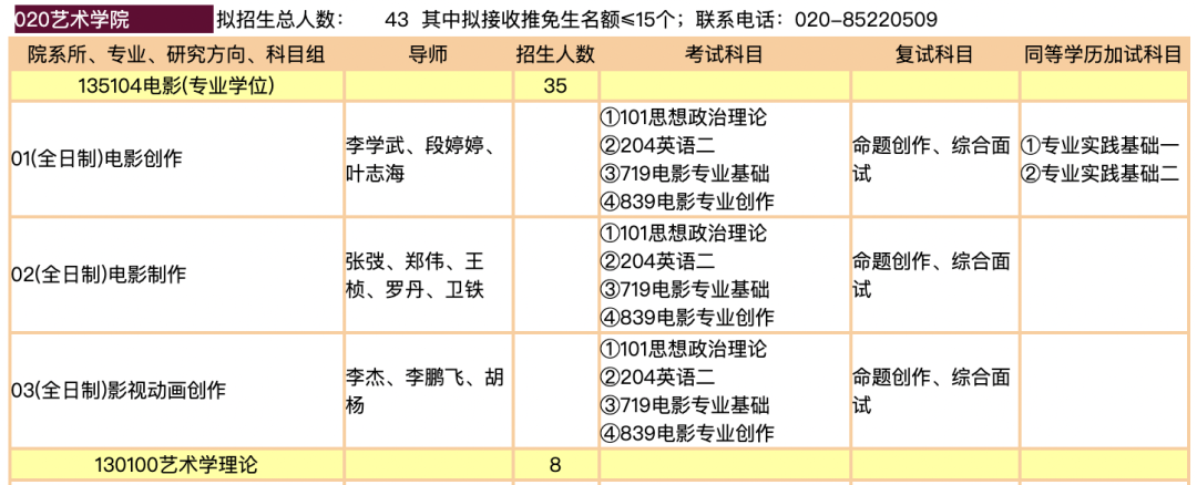 1.2019 年,可视为暨南大学电影考研的一个转折点,它从招生8人,猛增至21人,该年报名人数虽有增加,但报录比仅4.5:1。2020年录取名额再创新高,共录取35人(统考28人),当然报名人数也增涨到244人,报录比8.7:1;但这个数字也说不上竞争激烈,在电影学考研的院校中,10+:1的大有人在。当然,可以预见的是,2021、2022乃至以后,暨大电影的总体考研难度将会逐步加大。