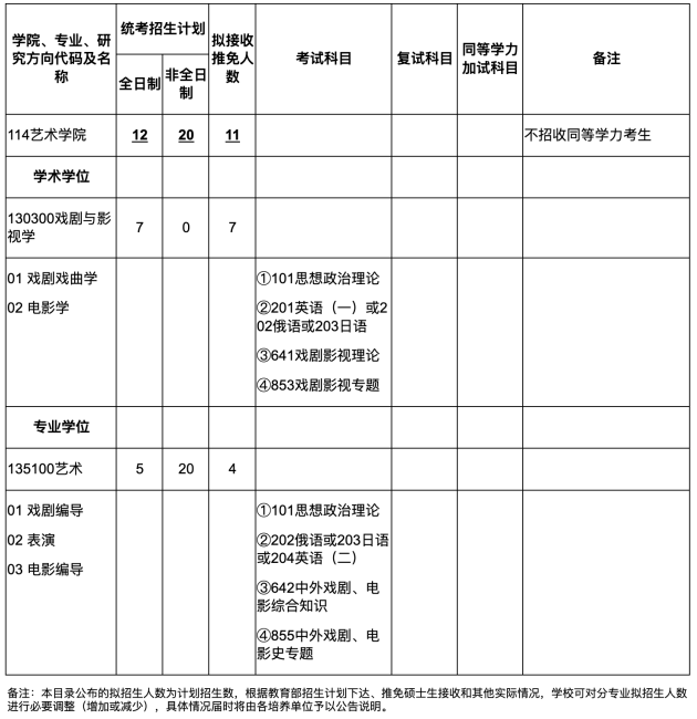1. 101思想政治理论 2. 201英语一 或 203日语 3. 642中西戏剧理论基础(适用戏剧戏曲学方向) 643电影史与电影理论(适用电影学方向) 644影视艺术理论(适用广播电视艺术学方向) 4. 877中国戏剧史(适用戏剧戏曲学方向) 878电影产业与文化(适用电影学方向) 879中外电视史(适用广播电视艺术学方向)
