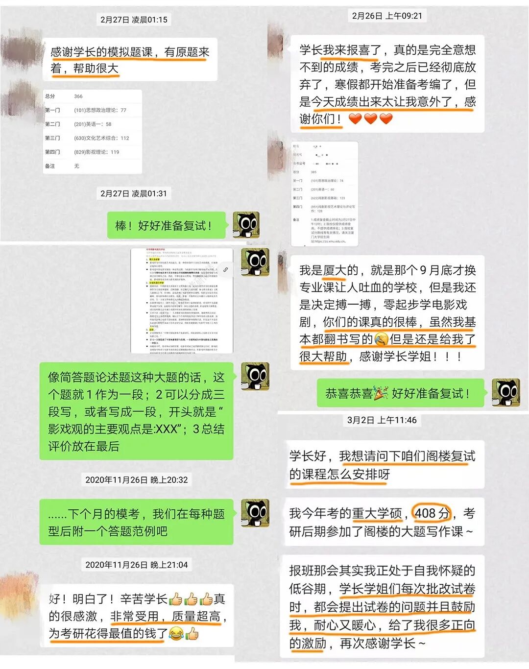当时师资力量有限(仅4人,现在阁楼师资团队已近30人),为保证质量,在名额上进行了限额。师资少,所以没有多招,但课程质量以及押题水平却还算靠谱,甚至……离谱,因为南师大的专二影视史论,我们基本押中了120分原题!而我们当时的出题团队里,并没有南师大的学长学姐。