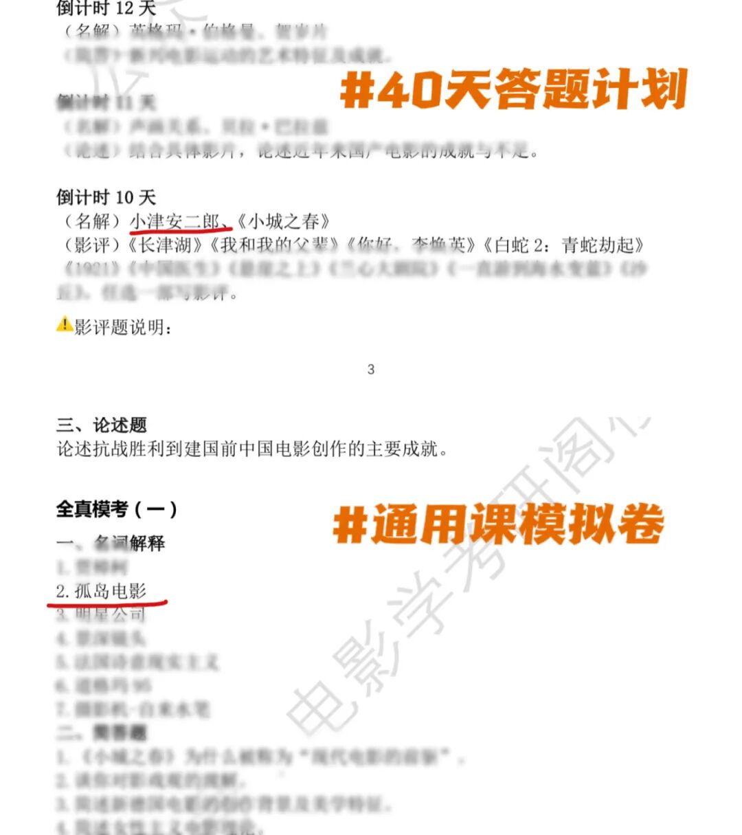 ③答题技巧:想要写好评论写作,需要开阔的眼界、丰厚的学识和独立的观点,没有捷径,唯有多读/看、多写、多思考。主要找戏剧史和电影史参考书目中提及的重要作品练笔,切忌泛泛而谈,面面俱到,既可以评写人物、主题、结构等,也可以尝试运用某种理论进行分析。半个小时以内构思文章结构,剩下的时间写,字数建议控制在2500-3000字,当然写完整就行,千万别担心字数不够强行增添,破坏文章整体结构和构思。在提升评论写作知识储备方面,可以参考以下两本书:《如何写影评》(蒂莫西·科里根 著)、《电影批评》(戴锦华 著),同时也可以广泛阅读知网上关于电影作品的论文,重点推荐学刊《当代电影》《电影艺术》《北京电影学院学报》,《电影文学》《电影评介》等亦不错,南京大学的刊物《戏剧与影视评论》(有公众号)也值得关注。初看学术论文,第一步是看框架的搭建,第二步是看内在逻辑的衔接,借鉴这两部分都能为评论写作增色不少,如果想要进一步了解深化评论写作,可关注阁楼后续全程班课程,将会推出影评课!