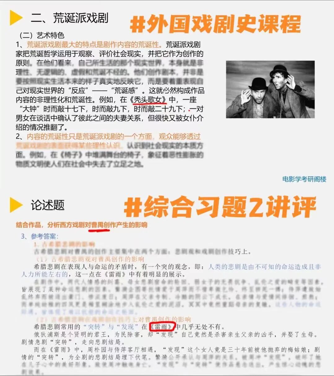③答题技巧:初试毕竟是一场争分夺秒拼高分的考试,所以对于知识点的熟悉运用和时间的合理分配都非常重要。针对前者,需要同学们在备考的时候对知识点做到一个由点及线、由线成面的梳理工作。由于题型设置涵盖了名词解释、简答和论述三个层次,也就是说作答的详略程度是不一样的。比如说曹禺可能会出名词解释,也可能会在简答或者论述环节阐述他整体作品的艺术成就,或者把单部作品拎出来分析艺术特色,又或者是把单部作品中的人物形象拎出来做赏析,然后横向比较,同时代还有哪些影响深远的剧作家,同样的梳理思路统整一遍。至于想要提高对时间的合理分配,就要勤练手保持一定的手感,50分钟左右答完名词解释,简答题15-20分钟一个,论试题不少于30分钟一个,并且简答题和论述题的答题形式建议采用总分总的结构来凸显知识的完整性和逻辑性。