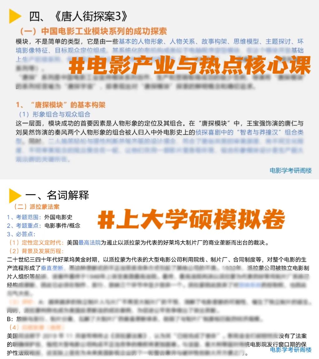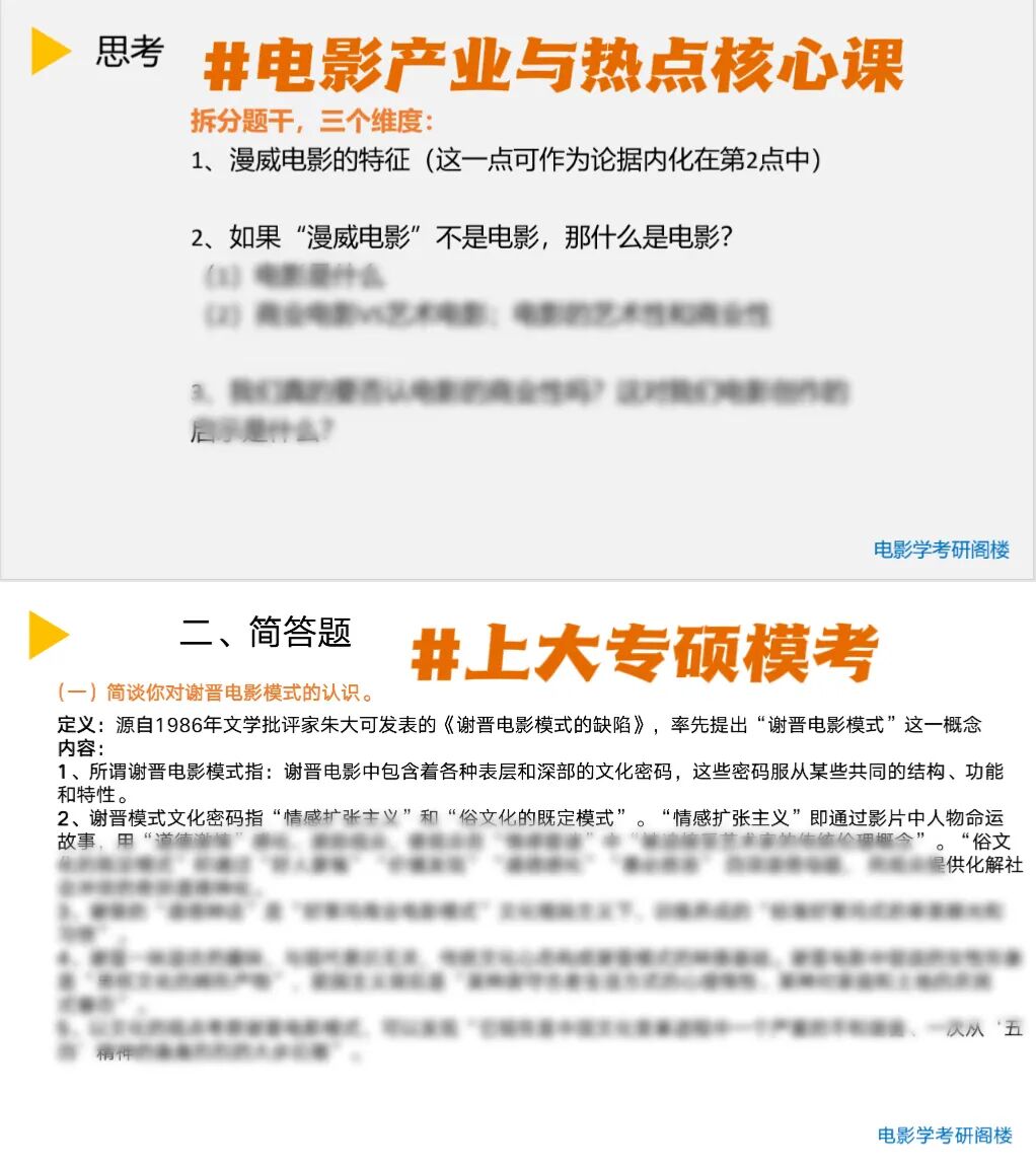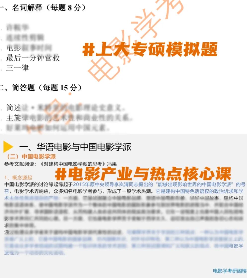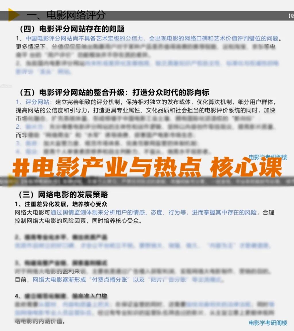 ③建议:备考时,既要有电影产业框架知识,对于基本概念要熟知;同时,保持敏锐的热点嗅觉,在观影、看论文时提炼考点;培养个人的学术“语感”和逻辑思维能力,在大量主观题面前能条理清晰地阐述自己的观点;也要注重中外电影产业发展、电影产业的构成等基础知识的学习,联系电影史与电影理论,形成完整的学科体系。