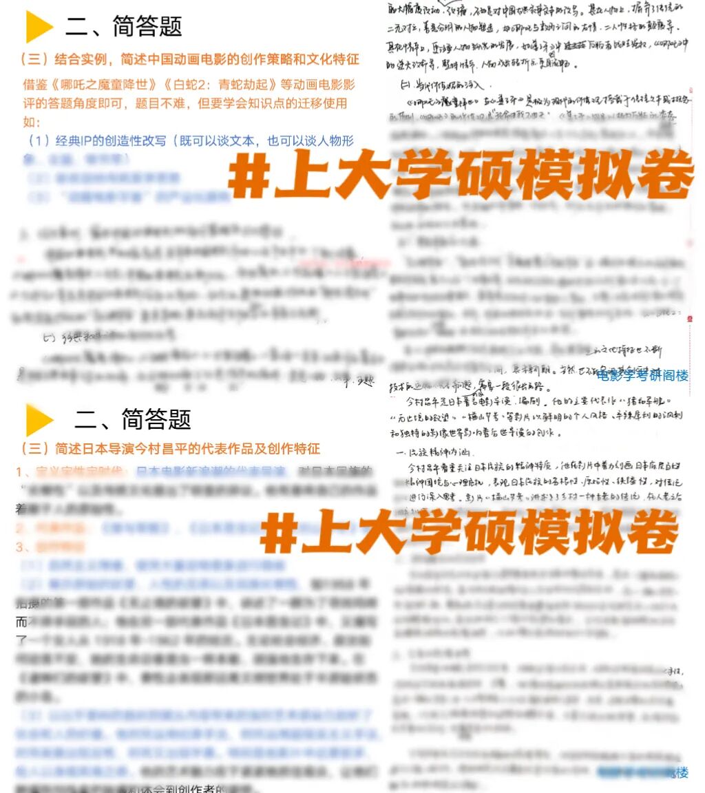 从风格特征来看,首先,上大非常注重导演诞辰、周年纪念或特殊事件等,今年考察的夏衍、今村昌平、阿巴斯等都属于这一类,只要考前注意影史周年方面的积累,就极有可能压中原题;其次,重复性高频考点仍然常见,比如理性蒙太奇、安东尼奥尼等;再次,评论题多为电影热点或学界热议话题,与专业二关联性强。
