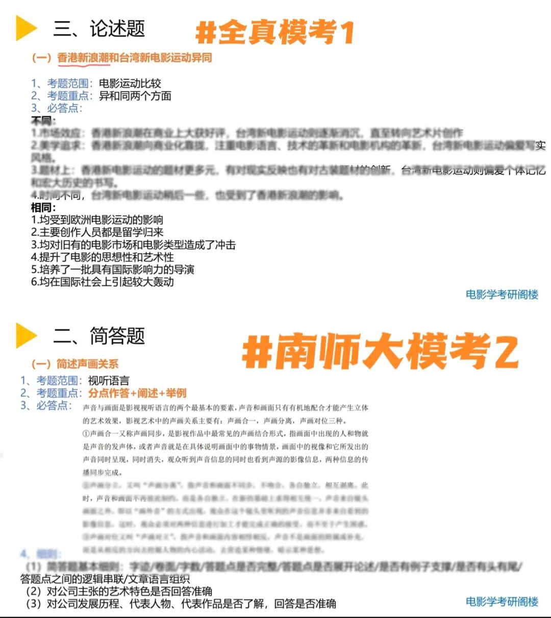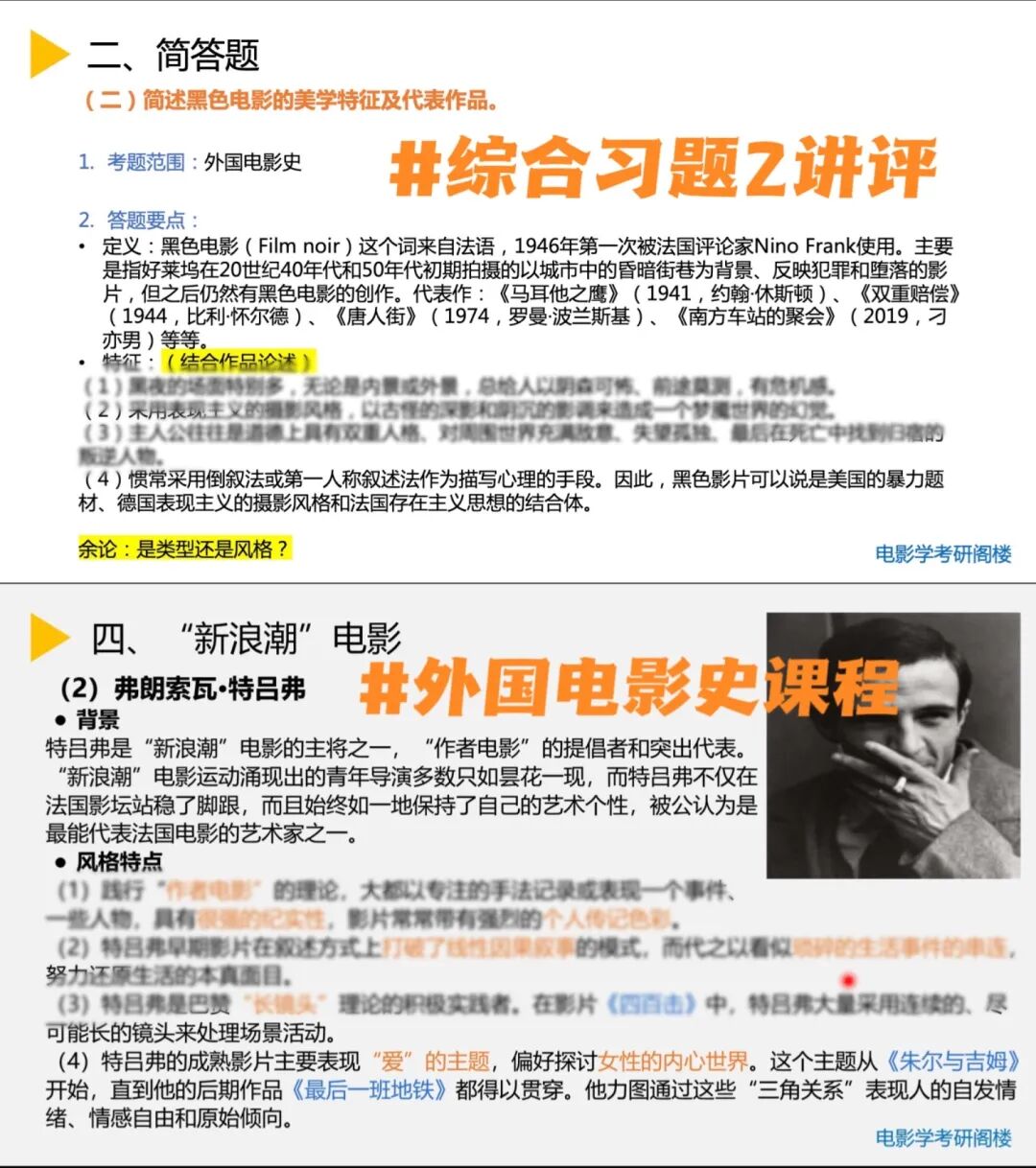 ③试题内容分析:具体来讲,名词解释中特吕弗、《早春二月》这种电影史的重要人物和作品是近几年南师名解考试必考内容;黑色电影和党的电影小组考察较细,黑色电影是外国电影史的内容,往年考察不多,但近几年国产黑色电影增加,例如《南方车站的聚会》等,也可以看作与影视热点挂钩的题目,党的电影小组属于中国左翼电影时期的知识点;杂耍蒙太奇更多的是早期南师常考的题目,理论上属于爱森斯坦的蒙太奇论中的知识点。