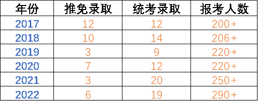 复试分数线总体上涨,复试人数基本维持在15人左右,在2021年达到24人,2022年复试人数保持相当,总分上涨至389分。