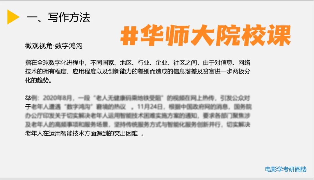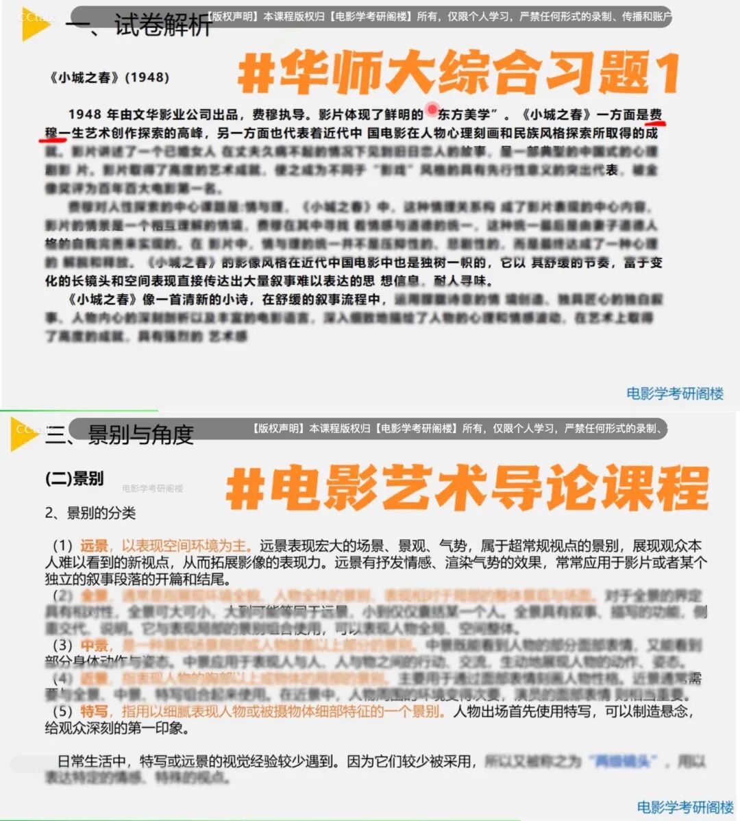②从考试范围来看,华师大几乎名词解释、简答和论述都会考到电影理论。可见华师大的题目中电影理论是重中之重。而21年名词解释中三个艺术概论和22年名词解释中出的三个镜头语言则要求考生的知识系统全面完善而且不留漏洞。但是,虽然华师大的题目考得非常广泛,其题目内容完全没有超出参考书目之外。2021年克拉考尔对迪斯尼的批判更是直接出自参考书目《动画概论》的书后原题。因此总结而言,从历年考题可以看出,华师在考察融会贯通能力的同时,也要求考生对参考书目中的细节进行一定程度的掌握。