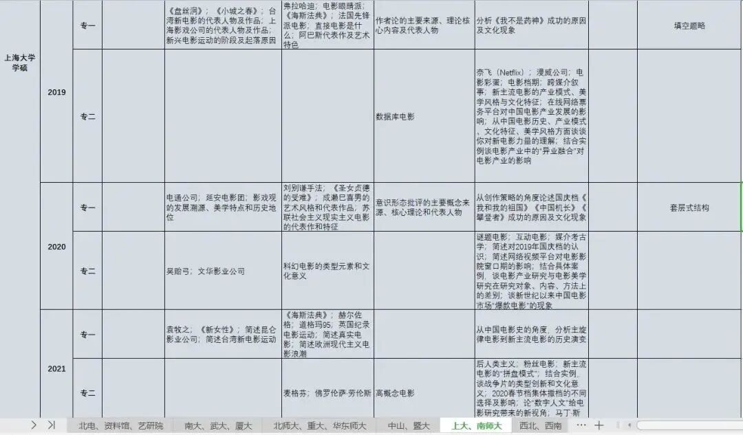 同时,我们还对热门院校的最近五年真题,按照电影创作基础、中国电影史、外国电影史、电影理论、电影产业与热点、剧本写作、其他进行了分类整理,做成了Excel表格,让大家可以更清晰直观看出院校的出题规律。