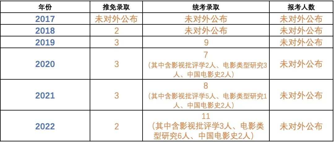 对于三个方向来说,由于03中国电影史题目范围比较广泛且专业二只有一道论述题,分值极大,需要考生知识基础扎实且文字能力极强,因此报考人数是三个方向中较少的,每年招生人数也不多,大概在2个人左右。