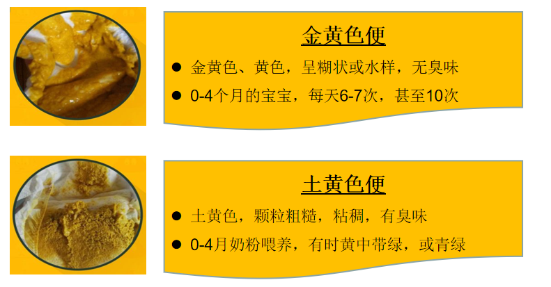 0-4个月的宝宝,因喂养方式不同大便也不一样,母乳喂养的新生儿便便颜色多为金黄色、黄色,呈糊状或水样,无臭味。因母乳中含有能刺激肠胃蠕动的脂肪酸,便便次数比较多,每天6-7次甚至可能达到10次,但是生长状态良好家长也不用担心,因为这是生理性腹泻,只要母乳喂养就可能出现,持续时间较长。