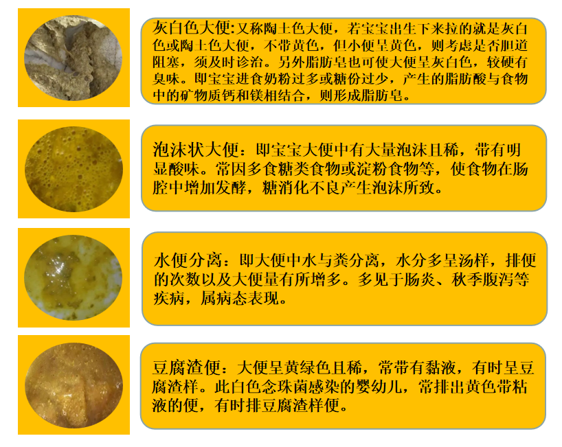 大便颜色和性状改变都可能宝宝肠胃问题的预警信号。以下为几种异常的大便:
