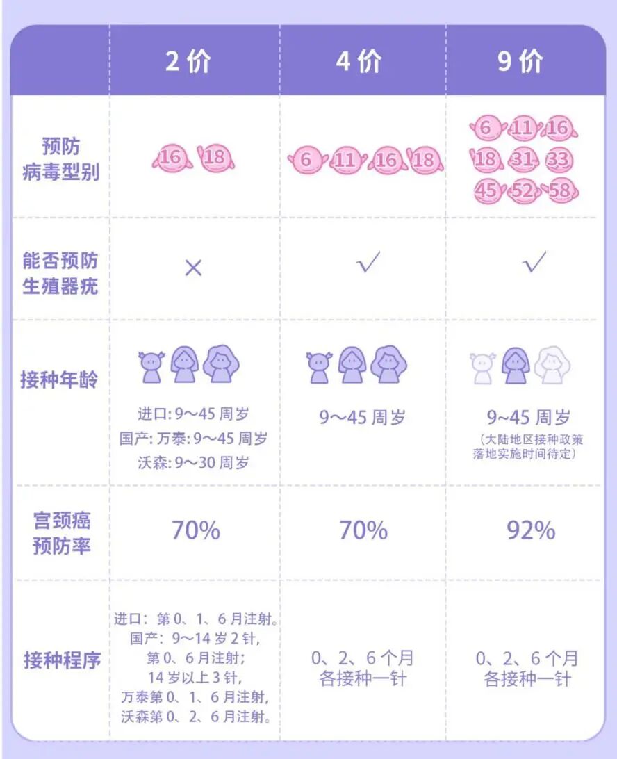 因此,预防HPV感染,接种HPV疫苗是预防宫颈癌的有效措施。市面上的HPV疫苗有2价、4价和9价三种,分别覆盖不同亚型的病毒类型。HPV疫苗除了预防宫颈癌,还能预防外阴癌、阴道癌、肛门癌、口腔癌、阴茎癌等恶性肿瘤及其癌前病变以及生殖器湿疣等皮肤病。