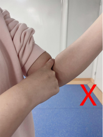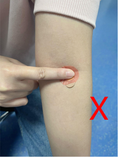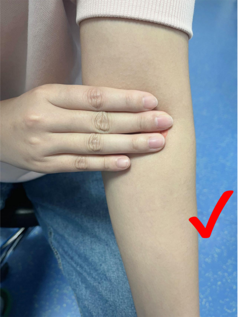 伸展手臂,三个手指头压住止血贴,压力需覆盖注射点及其上方1~2厘米处,坚持按压3~5分钟。