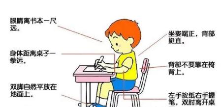 不合适的桌椅会对坐姿、视距造成很大的影响,导致近视和脊柱弯曲等疾病的发生。正确的桌椅高度应该能使人坐着的时候保持两个基本垂直:当两脚平放在地面时,大腿与小腿能够基本垂直。当两臂自然下垂时,上臂与小臂基本垂直,这时桌面高度应该刚好与小臂下平面接触。