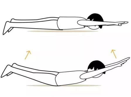 在硬床上或干净的硬质地板上,取俯卧位,脸部朝下,双臂以肩关节为支撑点,轻轻抬起,手臂向上的同时轻轻抬头,双肩向后向上收起。与此同时,双脚轻轻抬起,腰底部肌肉收缩,尽量让肋骨和腹部支撑身体。