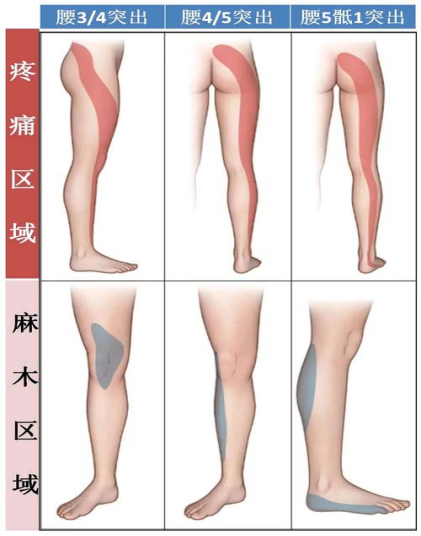 最常见的突出部位腰4-腰5发生病变时,会出现大腿后外侧,小腿前外侧疼痛,足背脚趾出现麻木。
