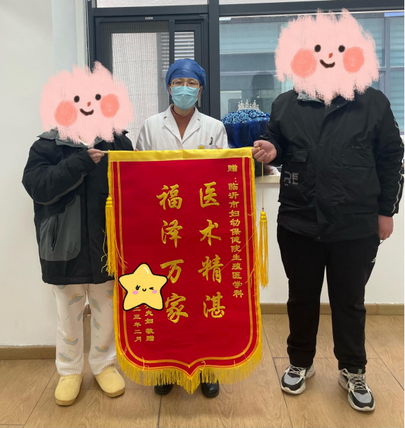 “主任,前面我怀了3次,掉了3次,全靠您精湛的医术,我才能生下了这个孩子。您就是我们全家的救星啊!这面锦旗还请您收下,以表达我们的谢意”