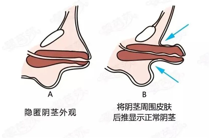 隐匿性阴茎是先天性发育异常所致,以肥胖儿多见,原因有三种: