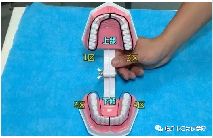 电动牙刷与平时手动刷牙的方式差不多。先来看这个模型,我们将口腔分为四个区,通常都是刷完一个区再刷另一个区,这样就不会有遗漏了。